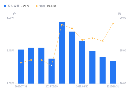 近一年(2024年10月31日至2025年10月31日),科新机电A股股东户数从2.11万户,增加至2.21万户,增幅4.56%,区间股价上涨55.76%。