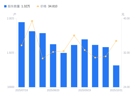 近一年(2024年10月31日至2025年10月31日),共创草坪A股股东户数从9596户,增加至1.32万户,增幅37.32%,区间股价上涨74.31%。