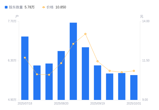 近一年(2024年10月31日至2025年10月31日),国芳集团A股股东户数从2.82万户,增加至5.78万户,增幅105.04%,区间股价上涨147.10%。