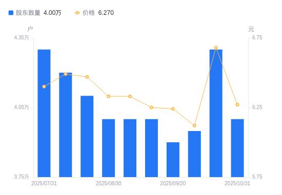 近一年(2024年10月31日至2025年10月31日),大连热电A股股东户数从5.7万户,减低至4万户,降幅29.82%,区间股价下跌24.64%。