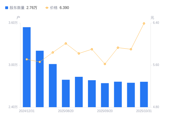 近一年(2024年12月31日至2025年10月31日),钱江生化A股股东户数从3.54万户,减低至2.76万户,降幅21.96%,区间股价上涨10.57%。