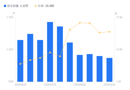 近一年(2024年12月20日至2025年10月31日),康普顿A股股东户数从1.5万户,减低至1.12万户,降幅25.33%,区间股价上涨75.63%。