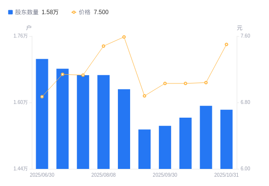 近一年(2024年10月31日至2025年10月31日),津膜科技A股股东户数从1.9万户,减低至1.58万户,降幅16.57%,区间股价上涨17.00%。