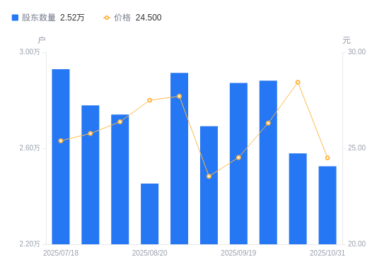 近一年(2024年10月31日至2025年10月31日),广信材料A股股东户数从3.13万户,减低至2.52万户,降幅19.22%,区间股价上涨31.30%。