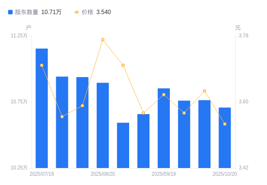近一年(2024年10月31日至2025年10月31日),陕国投AA股股东户数从10.15万户,增加至10.57万户,增幅4.13%,区间股价上涨2.25%。