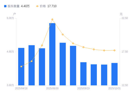 近一年(2024年12月31日至2025年10月31日),飞天诚信A股股东户数从5.06万户,减低至4.4万户,降幅13.06%,区间股价下跌2.80%。