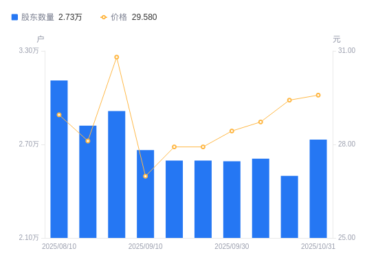 11月3日消息,数据显示,截至2025年10月31日,中新赛克A股股东总户数为2.73万户,较上期(2025年10月20日)增加2330户,增幅9.33%。公司最新A股总股本为1.71亿股,其中流通A股1.62亿股,户均持有流通A股数量为5940.68股,较上期减少554.18股,降幅8.53%;户均持流通A股市值17.57万元,较上期减少1.54万元,降幅8.04%。