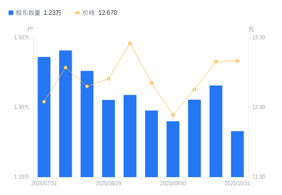 近一年(2024年10月31日至2025年10月31日),美能能源A股股东户数从1.59万户,减低至1.23万户,降幅22.58%,区间股价上涨37.88%。