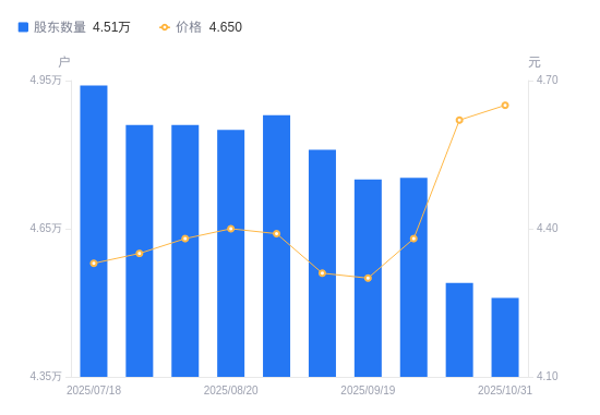 近一年(2024年10月31日至2025年10月31日),东南网架A股股东户数从5.24万户,减低至4.51万户,降幅13.93%,区间股价上涨2.20%。