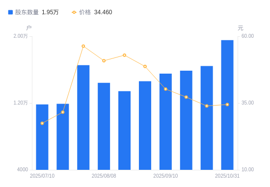 近一年(2024年10月31日至2025年10月31日),海特生物A股股东户数从1.1万户,增加至1.95万户,增幅77.26%,区间股价上涨23.56%。