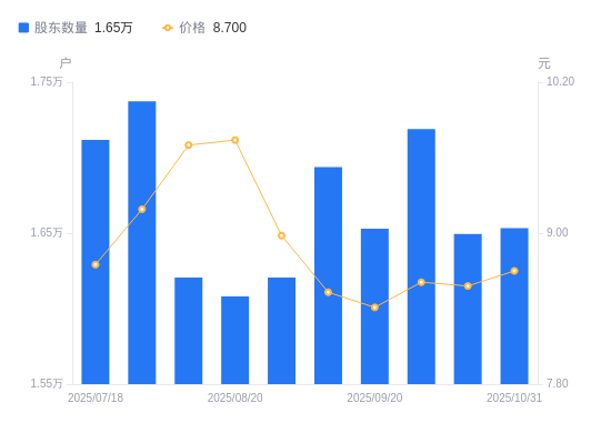 近一年(2024年10月31日至2025年10月31日),勘设股份A股股东户数从2.29万户,减低至1.65万户,降幅27.66%,区间股价上涨41.46%。