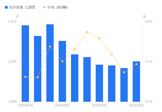 近一年(2024年12月31日至2025年10月31日),恒兴新材A股股东户数从1.65万户,减低至1.2万户,降幅27.03%,区间股价上涨22.35%。