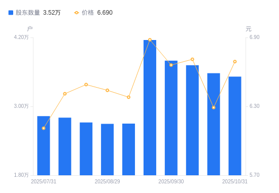 近一年(2024年11月8日至2025年10月31日),中汽股份A股股东户数从3.54万户,减低至3.52万户,降幅0.70%,区间股价下跌0.34%。