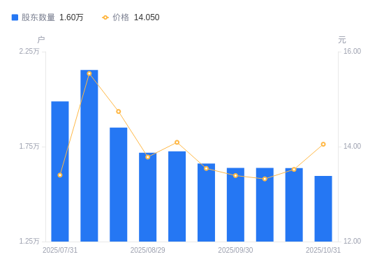 近一年(2024年10月31日至2025年10月31日),启迪设计A股股东户数从1.6万户,减低至1.6万户,降幅0.52%,区间股价上涨17.67%。