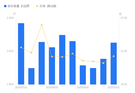 近一年(2024年10月31日至2025年10月31日),易明医药A股股东户数从1.76万户,增加至2.11万户,增幅20.38%,区间股价上涨112.31%。