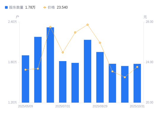 近一年(2024年11月20日至2025年10月31日),华如科技A股股东户数从1.94万户,减低至1.78万户,降幅8.56%,区间股价上涨15.73%。