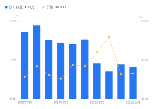 近一年(2024年11月20日至2025年10月31日),凯旺科技A股股东户数从1.6万户,减低至1.13万户,降幅29.38%,区间股价上涨2.16%。