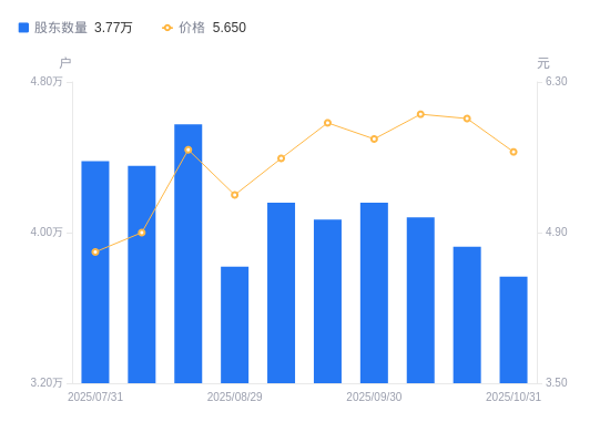 近一年(2024年10月31日至2025年10月31日),宝莫股份A股股东户数从4.07万户,减低至3.77万户,降幅7.47%,区间股价上涨32.01%。
