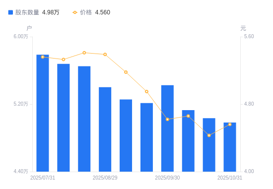 近一年(2024年10月31日至2025年10月31日),安诺其A股股东户数从6.3万户,减低至4.98万户,降幅20.88%,区间股价下跌28.97%。