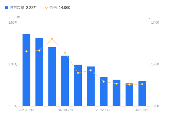 近一年(2024年12月20日至2025年10月31日),天邑股份A股股东户数从2.9万户,减低至2.22万户,降幅23.52%,区间股价下跌22.70%。