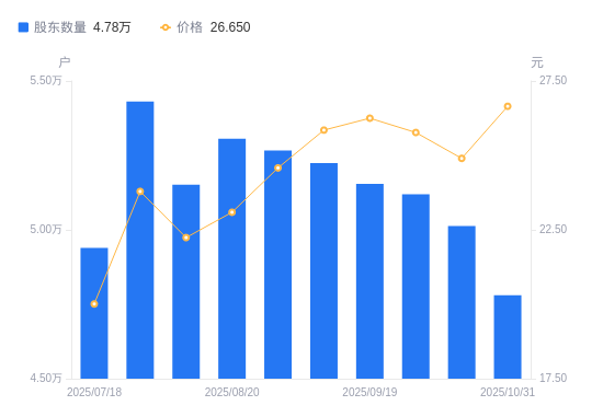近一年(2024年10月31日至2025年10月31日),博腾股份A股股东户数从4.81万户,减低至4.78万户,降幅0.68%,区间股价上涨46.35%。