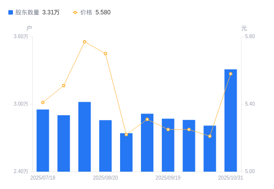 近一年(2024年10月31日至2025年10月31日),迦南科技A股股东户数从2.7万户,增加至3.31万户,增幅22.70%,区间股价上涨31.91%。