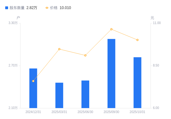 近一年(2024年12月31日至2025年10月31日),大业股份A股股东户数从2.66万户,增加至2.82万户,增幅5.99%,区间股价上涨29.83%。