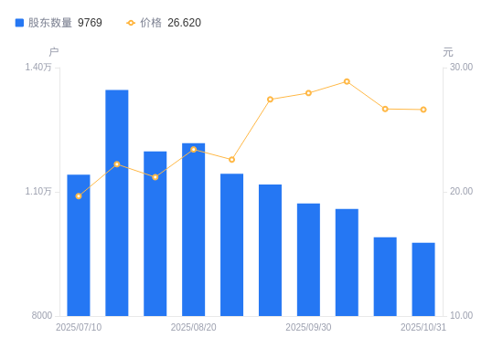 近一年(2024年10月31日至2025年10月31日),星华新材A股股东户数从1.38万户,减低至9769户,降幅29.39%,区间股价上涨66.36%。