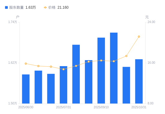近一年(2024年10月31日至2025年10月31日),奥联电子A股股东户数从2.22万户,减低至1.63万户,降幅26.72%,区间股价上涨51.36%。