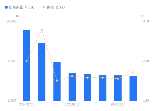 近一年(2024年12月31日至2025年10月31日),*ST星光A股股东户数从9.18万户,减低至4.5万户,降幅50.98%,区间股价下跌19.22%。
