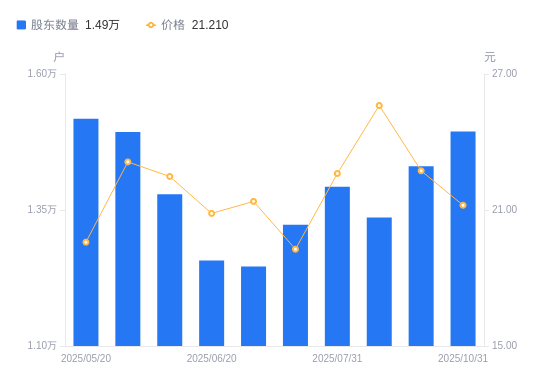 近一年(2024年12月31日至2025年10月31日),万通智控A股股东户数从1.73万户,减低至1.49万户,降幅13.86%,区间股价上涨73.27%。