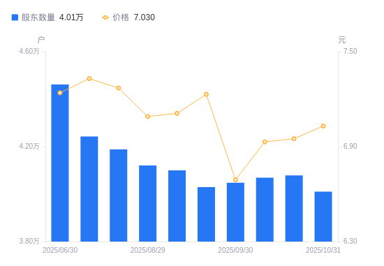 近一年(2024年12月31日至2025年10月31日),新农开发A股股东户数从4.47万户,减低至4.01万户,降幅10.37%,区间股价上涨7.99%。