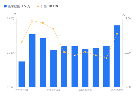 近一年(2024年12月20日至2025年10月31日),鸥玛软件A股股东户数从1.49万户,增加至1.55万户,增幅4.12%,区间股价上涨6.68%。