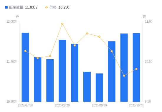 近一年(2024年10月31日至2025年10月31日),联创电子A股股东户数从12.95万户,减低至11.83万户,降幅8.66%,区间股价上涨4.49%。