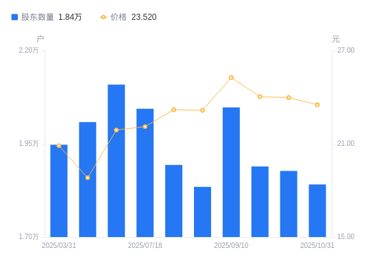 近一年(2024年12月31日至2025年10月31日),鼎龙科技A股股东户数从2.2万户,减低至1.84万户,降幅16.40%,区间股价上涨13.73%。
