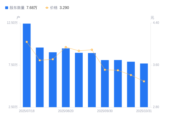 近一年(2024年10月31日至2025年10月31日),金一文化A股股东户数从2.18万户,增加至7.68万户,增幅252.62%,区间股价上涨2.17%。