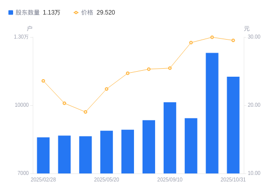 11月6日消息,数据显示,截至2025年10月31日,盈建科A股股东总户数为1.13万户,较上期(2025年10月20日)减少1046户,降幅8.50%。公司最新A股总股本为7943.07万股,其中流通A股6027.37万股,户均持有流通A股数量为5353.85股,较上期增加455.15股,增幅9.29%;户均持流通A股市值15.8万元,较上期增加1.12万元,增幅7.61%。