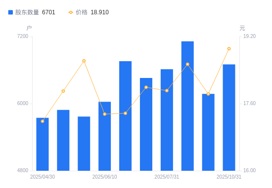 近一年(2024年10月31日至2025年10月31日),杰恩设计A股股东户数从5314户,增加至6701户,增幅26.10%,区间股价下跌6.48%。
