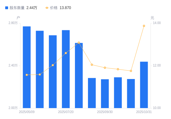 近一年(2024年11月20日至2025年10月20日),理邦仪器A股股东户数从2.43万户,减低至2.27万户,降幅6.44%,区间股价上涨12.41%。