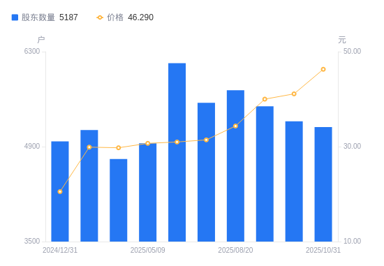 近一年(2024年10月31日至2025年10月31日),同大股份A股股东户数从6326户,减低至5187户,降幅18.01%,区间股价上涨122.79%。