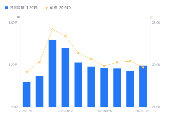 近一年(2024年10月31日至2025年10月31日),大宏立A股股东户数从1.45万户,减低至1.2万户,降幅17.74%,区间股价下跌6.93%。