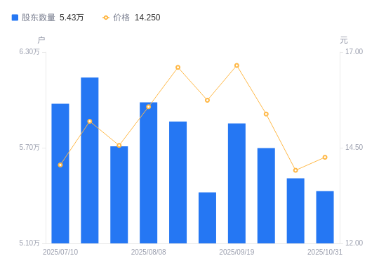 近一年(2024年10月31日至2025年10月31日),汉宇集团A股股东户数从2.86万户,增加至5.43万户,增幅89.91%,区间股价上涨67.25%。