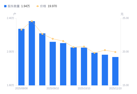 近一年(2024年11月20日至2025年11月10日),双飞集团A股股东户数从1.37万户,增加至1.94万户,增幅41.55%,区间股价上涨52.79%。