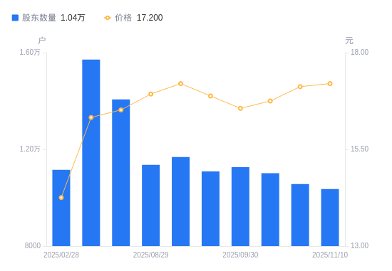 近一年(2024年12月31日至2025年11月10日),东利机械A股股东户数从1.08万户,减低至1.04万户,降幅4.24%,区间股价上涨26.24%。