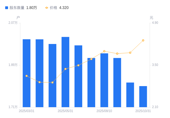 近一年(2024年11月20日至2025年10月31日),维尔利A股股东户数从2.17万户,减低至1.8万户,降幅17.05%,区间股价上涨7.20%。
