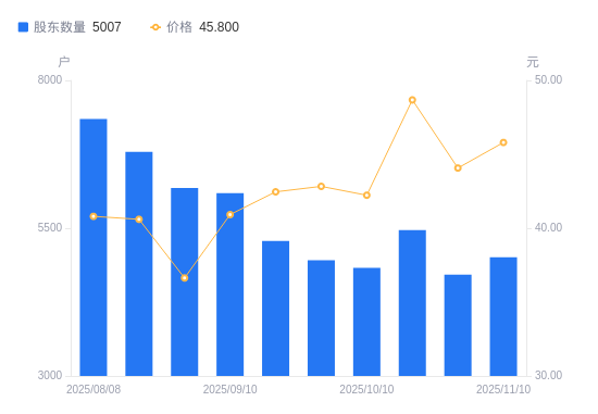 近一年(2024年12月31日至2025年11月10日),鸿铭股份A股股东户数从7383户,减低至5007户,降幅32.18%,区间股价上涨53.18%。