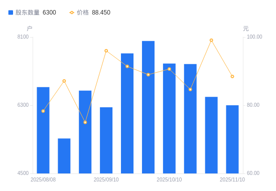 近一年(2024年11月20日至2025年11月10日),恒勃股份A股股东户数从8976户,减低至6300户,降幅29.81%,区间股价上涨216.48%。