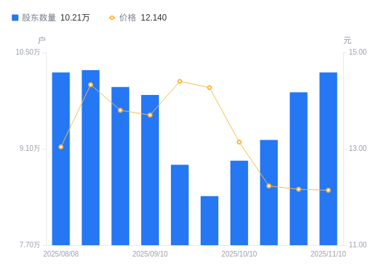 近一年(2024年12月20日至2025年11月10日),神州泰岳A股股东户数从10.53万户,减低至10.21万户,降幅3.02%,区间股价下跌2.88%。