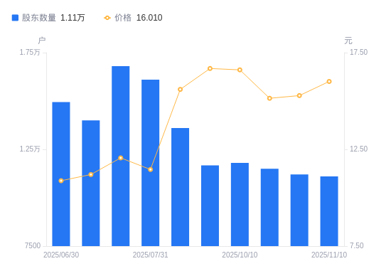 近一年(2024年12月20日至2025年11月10日),康普顿A股股东户数从1.5万户,减低至1.11万户,降幅26.00%,区间股价上涨84.02%。