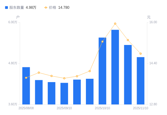 近一年(2024年11月20日至2025年11月10日),海得控制A股股东户数从5.13万户,减低至4.98万户,降幅2.94%,区间股价上涨29.99%。